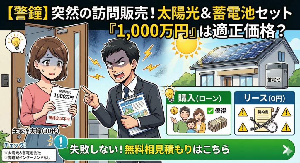 - 【警鐘】太陽光・蓄電池の訪問販売で「1,000万円」は適正?リースと購入の損得を徹底比較緊急消費者アラート 訪問販売の「高額提示」に注意!その1,000万円、本当に適正ですか? 太陽光・蓄電池の相場… 続きを読む: 【警鐘】太陽光・蓄電池の訪問販売で「1,000万円」は適正?リースと購入の損得を徹底比較