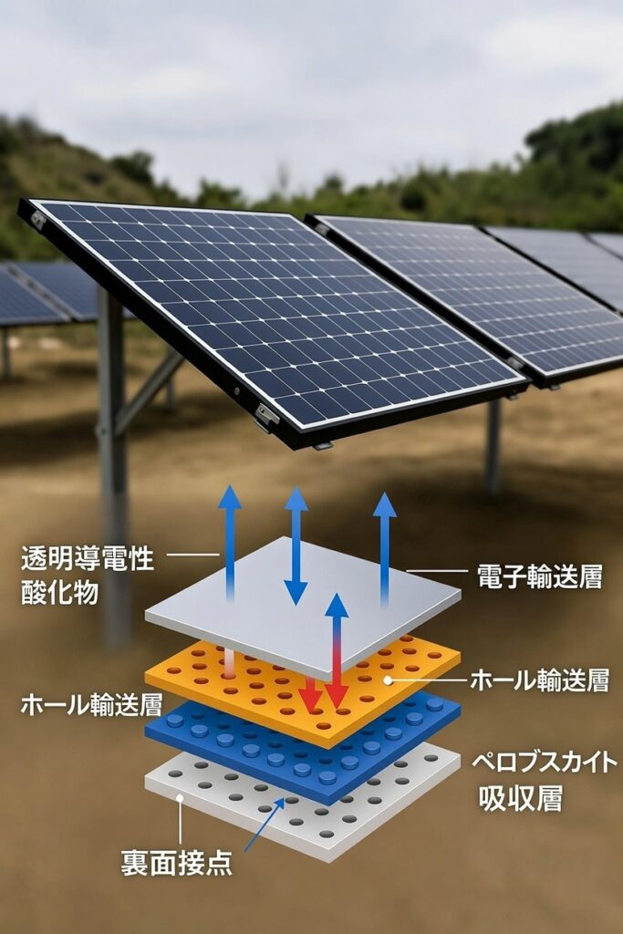 ペロブスカイト太陽電池は、2010年代に急速に発展した次世代型太陽電池です。名前は鉱物の「ペロブスカイト構造」に由来し、有機・無機ハイブリッド材料を使います。従来のシリコン電池(変換効率20〜25%)を超える30%以上の効率を目指せ、低コスト生産が可能。