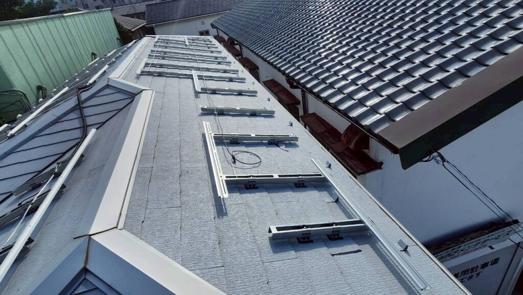 パネルを固定するためのレール(架台)を取り付けている様子です。