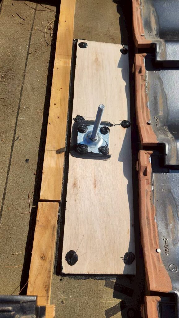 まず、瓦の下に専用の「補強板」を仕込みます。これにより、金具を屋根の構造体(垂木など)にガッチリと固定できます。